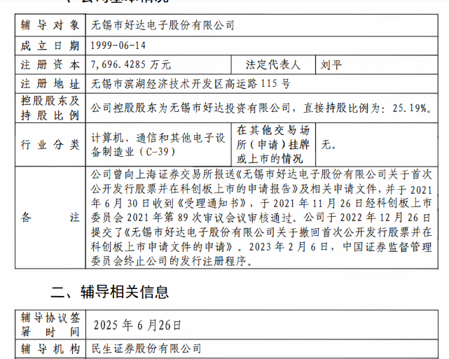 7月4日,无锡市好达电子股份有限公司(下称“好达电子”)向江苏证监局提交了上市引导备案申报,现任引导机构为民生证券。值得按捺的是,好达电子已经在国投证券的引导下于2023年2月17日提交过引导备案申报,“因公开垦行股票并上市的谋略调遣”,公司于2025年6月5日肯求闭幕国投证券的引导,而民生证券在“认同前任引导机构使命的基础上”链接完成对好达电子的引导使命。
