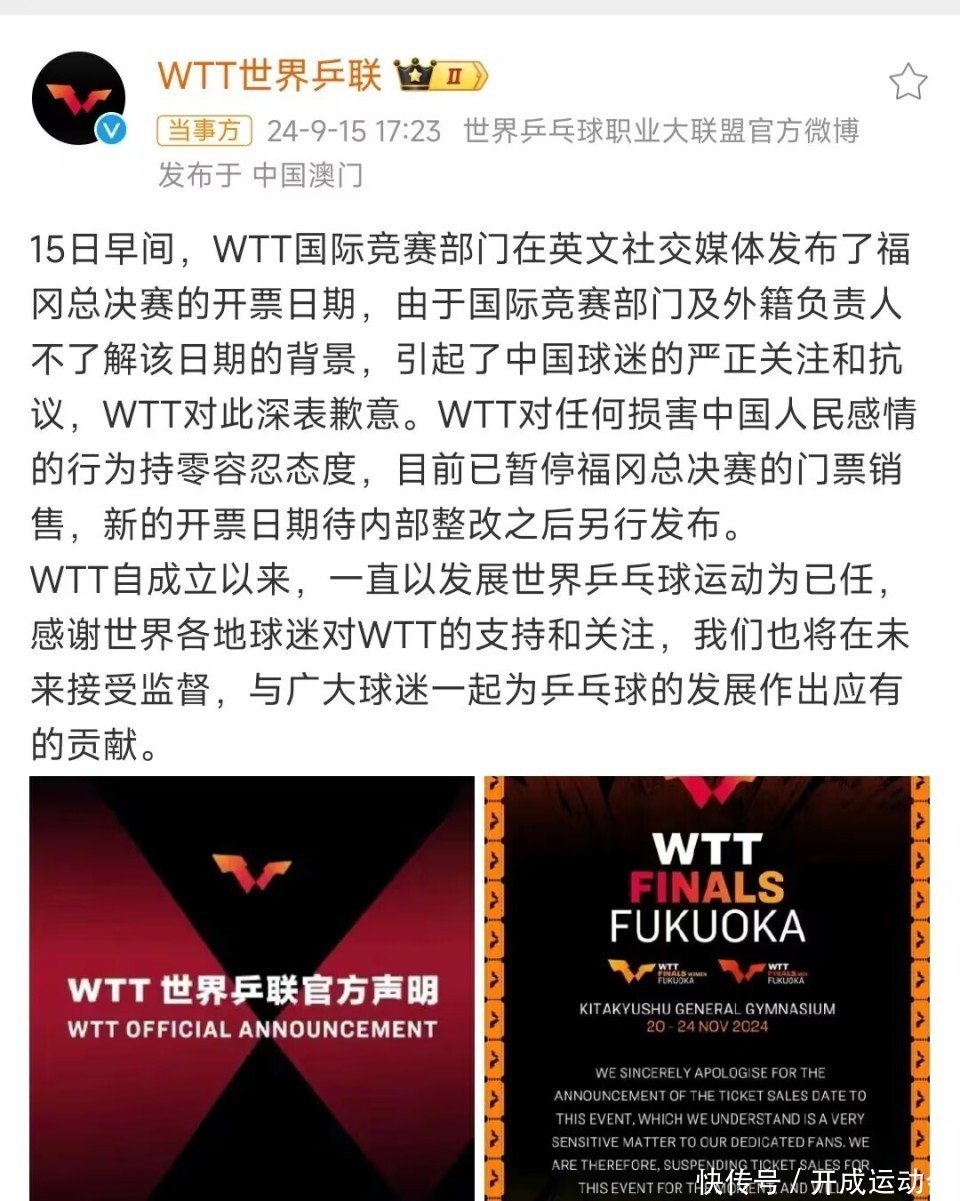 WTT宇宙乒联就福冈总决赛开票日历不妥谈歉,称不了解配景激勉中国球迷不悦,已暂停售票并整改,新日历待另行发布!